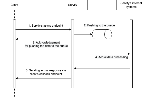 Consider using the asynchronous APIs when there's a need to send a large number of requests to Servify and no requirement for immediate responses. In this method, all incoming requests will be placed into a queue, and you will promptly receive confirmation that they have been successfully received.